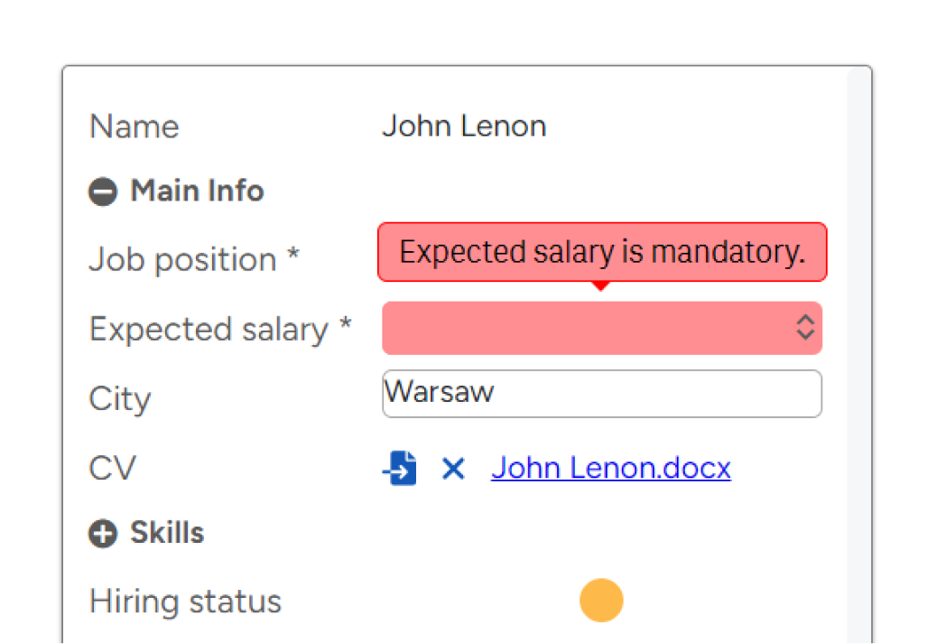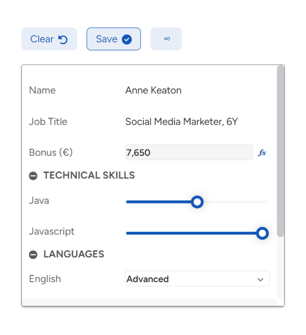 Egyetlen űrlap, amely egy adott alkalmazott, ügyfél vagy termék adatainak frissítésére szolgál. Ideális felmérésekhez is.