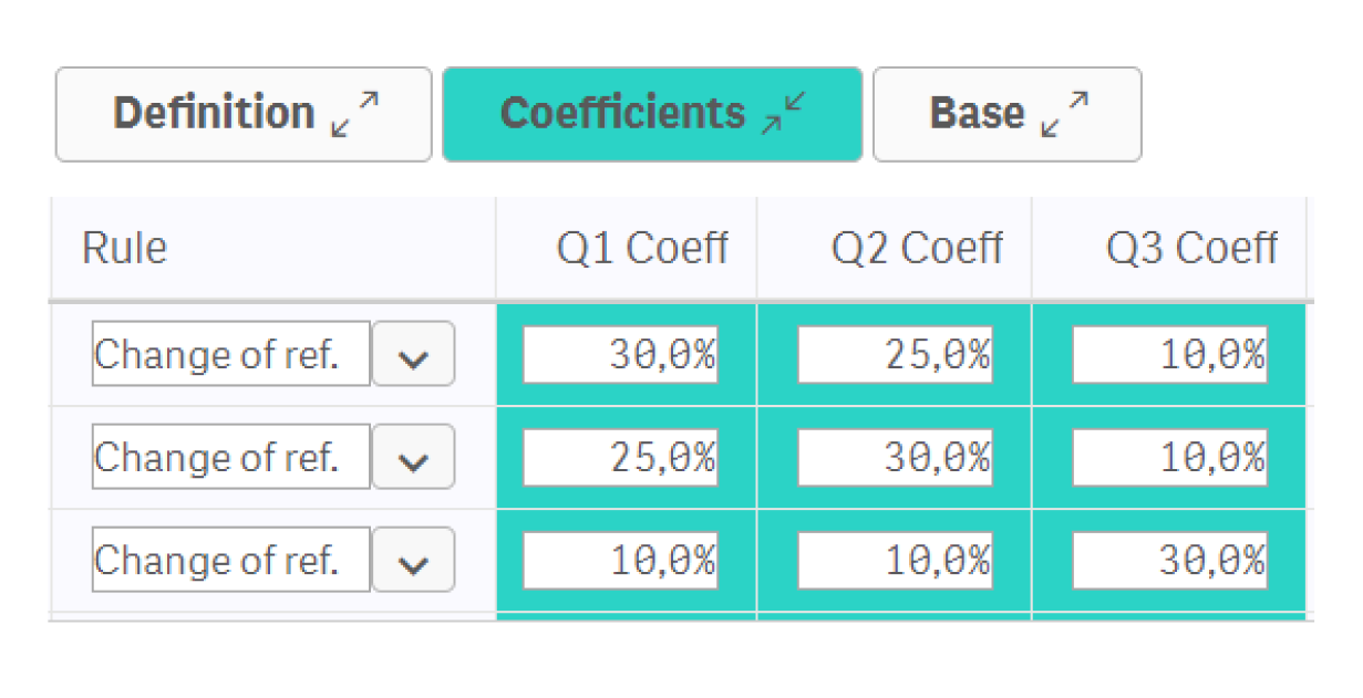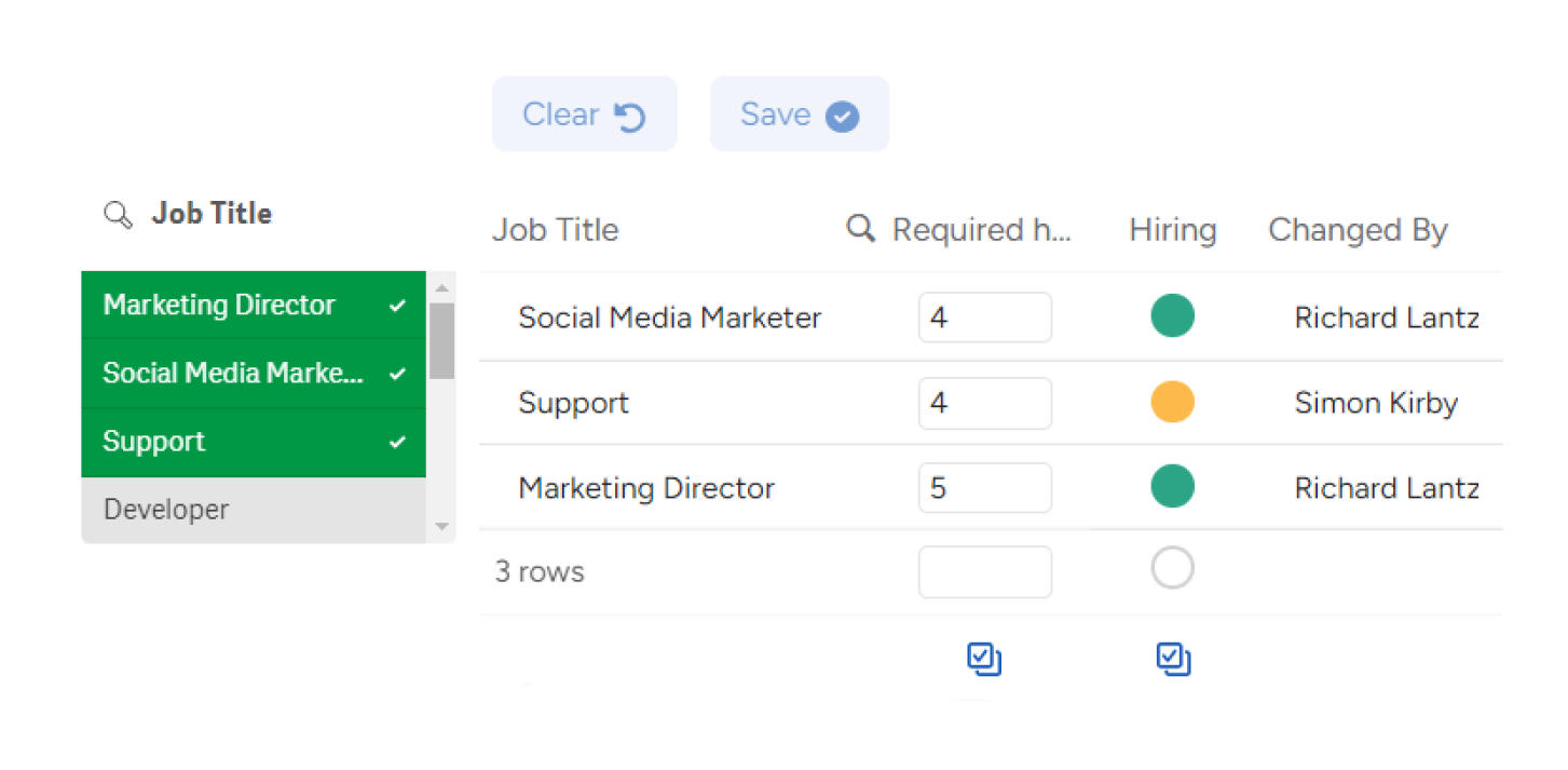 Olyan tábla, ami Qlik dimenziókat és mérőszámokat szerkeszthető mezőkkel kombinál. Ideális strukturált áttekintésekhez vagy több sor egyidőben történő frissítéséhez.