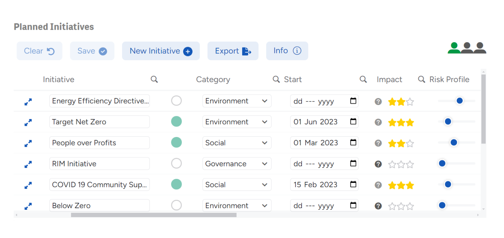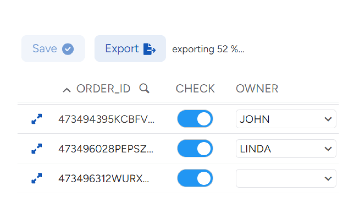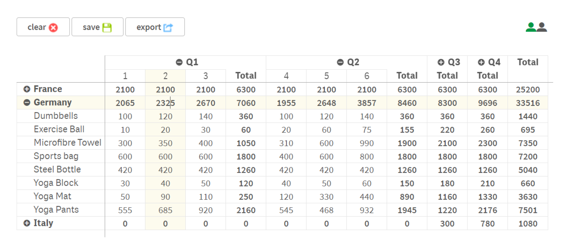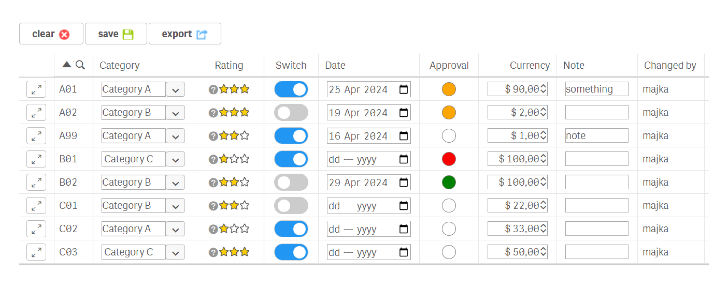 Olyan tábla, ami Qlik dimenziókat és mérőszámokat szerkeszthető mezőkkel kombinál. Ideális strukturált áttekintésekhez vagy több sor egyidőben történő frissítéséhez.