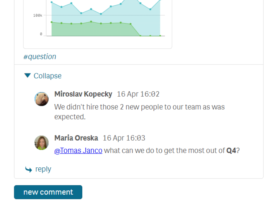 Az integrált csevegő funkció lehetővé teszi a specifikus Qlik-vizualizációkkal vagy sheet-ekkel kapcsolatos párbeszédeket, többféle formázási és címkézési lehetőséggel. Csatoljon Qlik-snapshot-okat vagy akár más fájlokat a megjegyzésekhez.